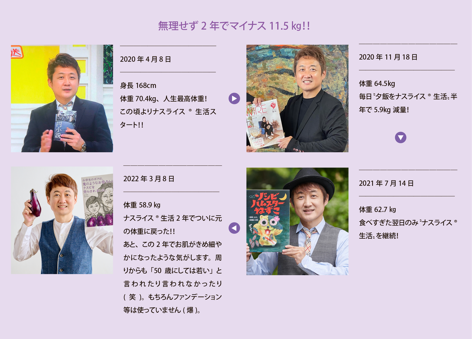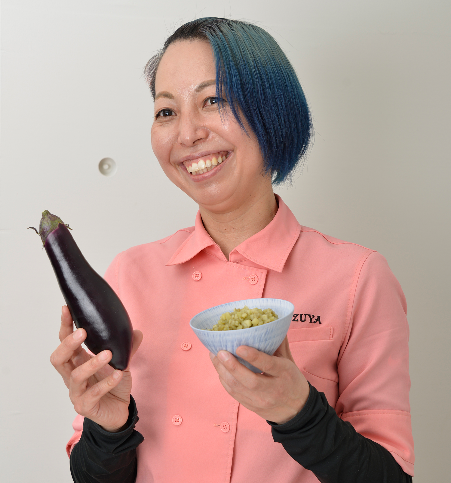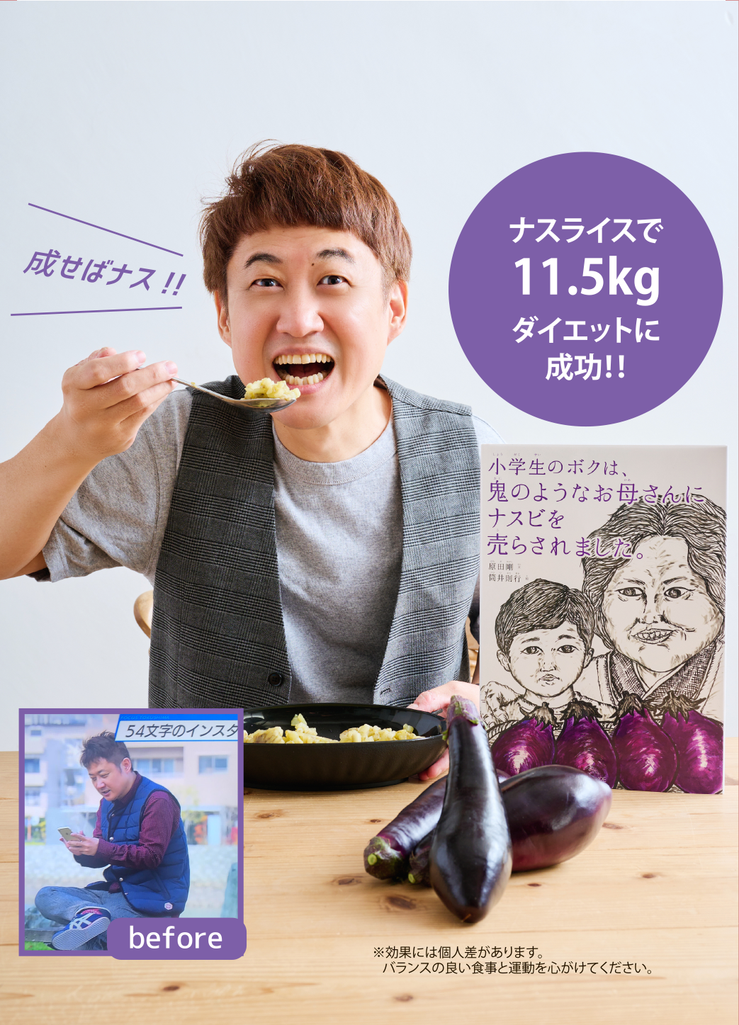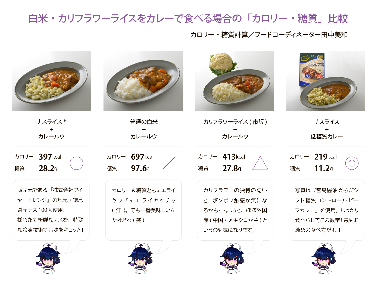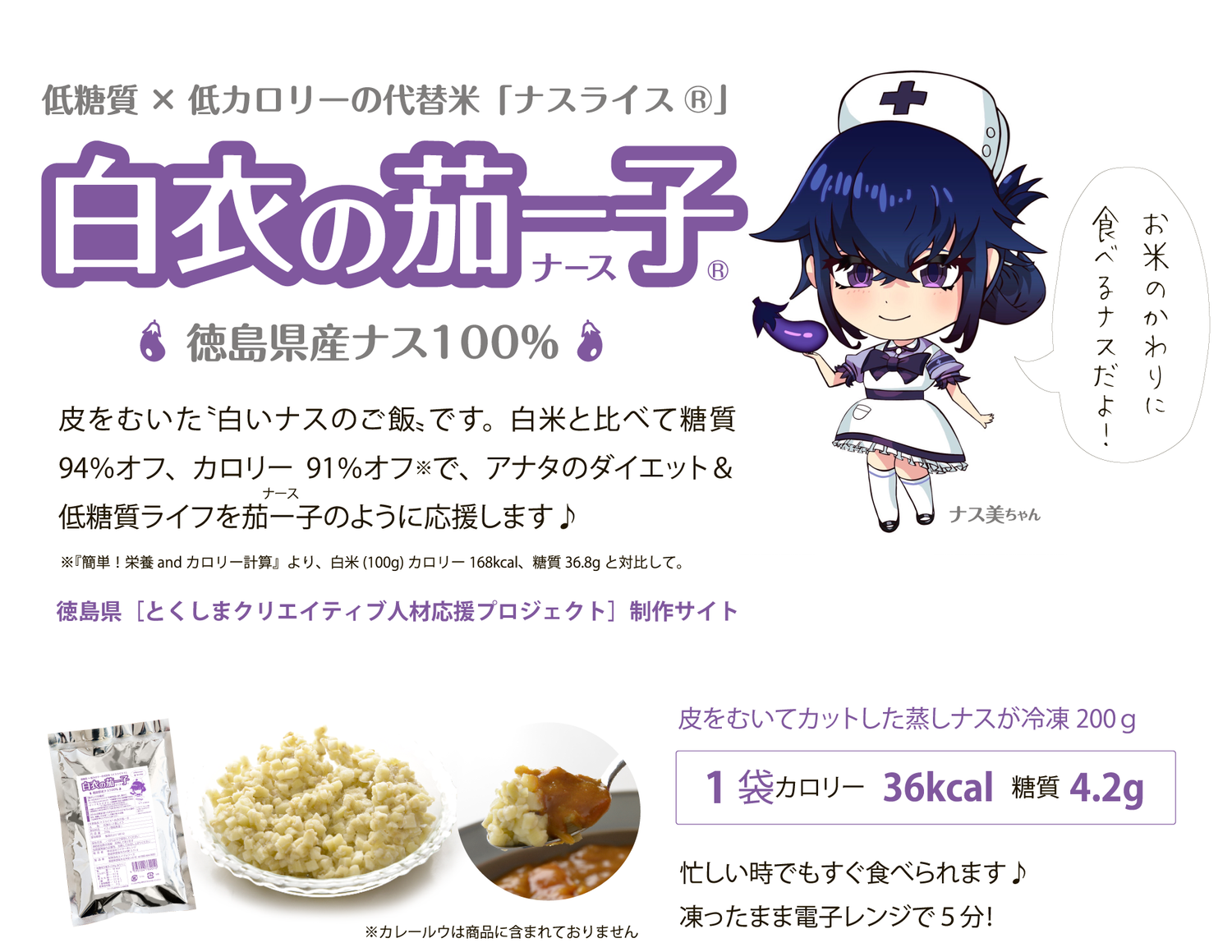 2020年春…コロナ禍のおこもり&作家という職業柄、完全なる運動不足と食べ過ぎで、元々は58㎏だった体重が、気づけば70㎏オーバー・・・・・。これはいかん、ということで、流行の〝低糖質ダイエット〟を始めてみました。しかし大好物のカレーライスだけは食べたくて、あるカレーチェーン店の『カリフラワーライス』を使った低糖質カレーを日々食べていました。さすがに毎日、外食というわけにはいかず、ネットで『カリフラワーライス』を購入して家庭でも食べていました。おかげで体重は徐々に減りだしたのですが気になることが2つ…①とにかく『カリフラワーライス』は独特の匂いとパサパサ感がとても気になる。もうひとつ②どのメーカーの『カリフラワーライス』もほぼ外国産(中国やメキシコが主)でした。私は健康のために痩せようとしているのに、これで良いのか?と自問自答し「だったら健康で美味しい別のライスを自作してやろう!」と、いろいろな野菜を試してみて、私の大好きな野菜・ナスがBESTであるという結論に行き着いたのです(私の実家は元ナス農家で、その物語を絵本にして出版したくらいナス好きなんです♪)。しかも、私の地元・徳島県で採れた安心できるナスを使用し、ナス好きの私が、何度も試行錯誤してそのカット法や調理法をテストしたので美味しくない訳がありません! 皮をむいた白い姿が、私を肥満から救ってくれたナースのように見えたので(笑)、『白衣の茄―子』と名づけました。むいた皮はもったいないので〝ナス茶〟にしました(これも美肌になれる!?)。なにより、糖尿病率ワーストワンのここ徳島県から、低糖質な食事の提案を拡げてゆきたいと思っておりナス!!