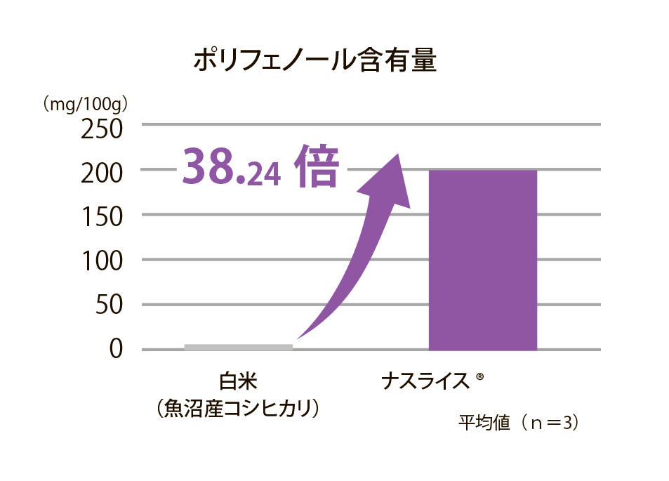 ポリフェノール含有量について、ナスライスは200.01mg/100gであり、白米(魚沼産コシヒカリ)の5.23mg/100gと比較して、38.24倍多いという分析結果が出ました。ポリフェノールは抗酸化作用を有する機能性成分として代表的な成分の一つで、美肌効果、メラニン抑制、シワ予防などのアンチエイジングに効果的であると言われています。本成分が多いことでナスライスは機能性が強い食材であると示されます。