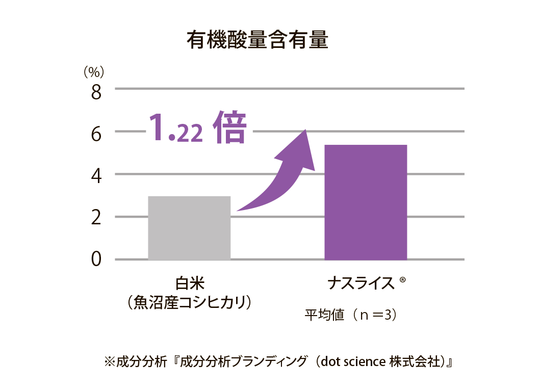 ナスライスの有機酸量は5.54%で、白米(魚沼産コシヒカリ)の4.53%と比較して1.22倍多いという分析結果が出ました。有機酸は〝コク〟や〝旨味〟に関わる成分であるから、ナスライスは奥行きのある味わい深いであると推察できます。ただし、もう一つの旨味成分・グルタミン酸の含有量は、ナスライスが157.52mg/Lに対し、白米(魚沼産コシヒカリ)が202.52mg/Lと0.78倍。やはり、一番美味しいのは白米ですが、〝代替米〟としてならナスライスは食べやすい部類に入ると思います。